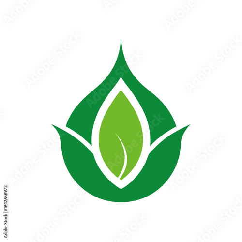 Green Leaf Emblem with Water Drop on Transparent Background