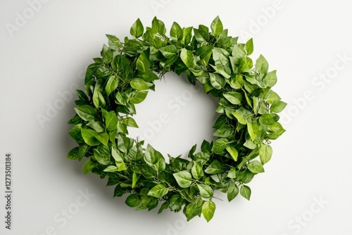 Green leaf wreath hanging on white wall for spring decoration and celebration