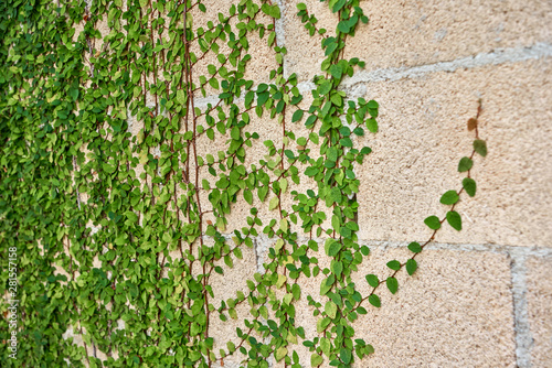 Green leaves growing on a brick wall