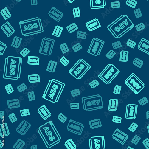 Green line Advertising icon isolated seamless pattern on blue background. Concept of marketing and promotion process. Responsive ads. Social media advertising. Vector.