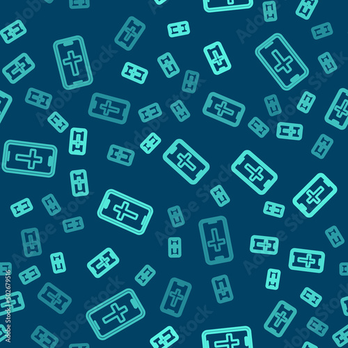 Green line Christian cross on mobile phone icon isolated seamless pattern on blue background. Church cross. Vector