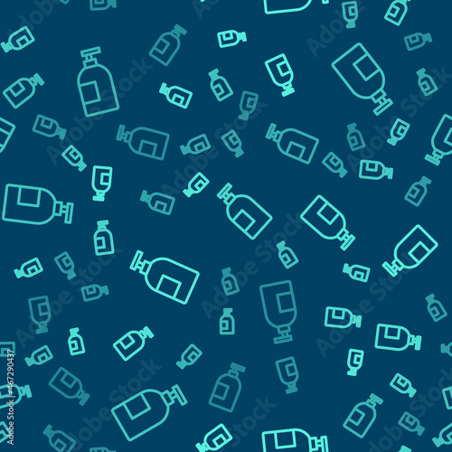 Green line Dishwashing liquid bottle icon isolated seamless pattern on blue background. Liquid detergent for washing dishes. Vector