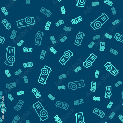 Green line Presentation, movie, film, media projector icon isolated seamless pattern on blue background. Vector