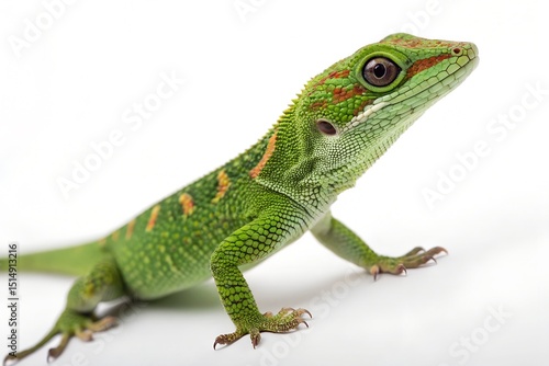 Green lizard isolated on white background, a vibrant reptile with an eye-catching gaze, perfect for themes of nature and wildlife