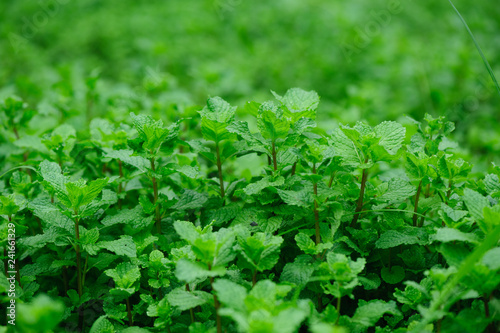 Green mint plant in growth at vegetable garden