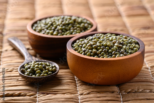 Green mung bean in wooden bowl with spoon, Food ingredients