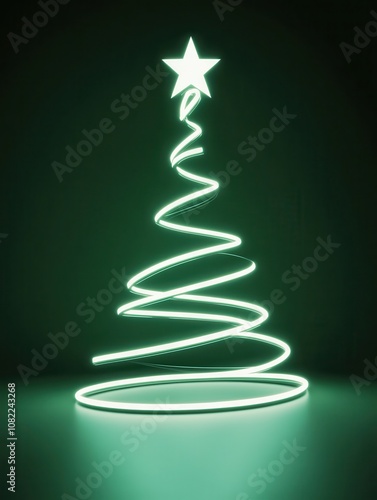 Green neon Christmas tree with star on dark background.