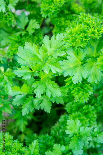 Green parsley growing in a vegetable garden close-up. Rustic background textural