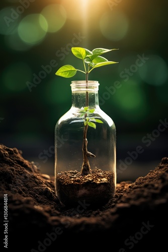 Green plant growing in glass bottle on soil. Eco-friendly concept, environmental conservation. Sustainable development and nature protection. Terrarium gardening.