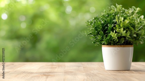 Green plant pot on wooden table, garden background, nature