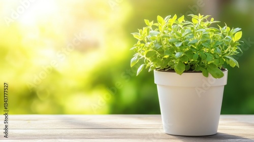 Green Plant Potted in a White Pot on Wooden Surface