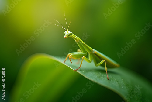 Green praying mantis peacefully perched on a leaf against a blurred green background