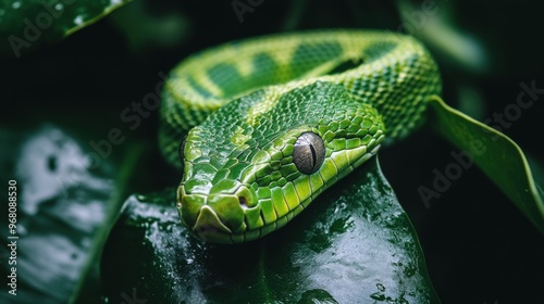 Green python resting on lush green leaves in a tropical rainforest during the daytime
