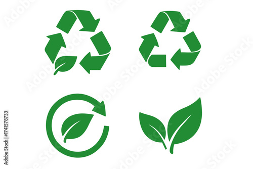 Green recycle icons with leaves, ecology, environment symbols, sustainable living, eco-friendly, nature conservation, vector illustration set with transparent background