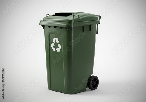 Green recycling bin on wheels against a light gray background