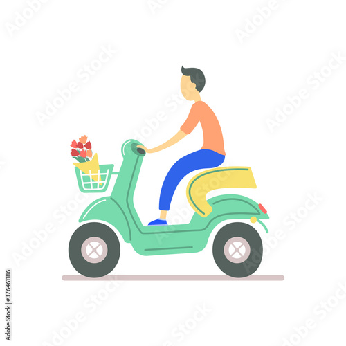 green scooter, young man and flowers