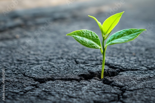 Green seedling growing through cracked asphalt representing new life, hope, and overcoming challenges
