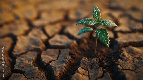 Green Seedling Growing Through Dry Cracked Soil in Nature Environment
