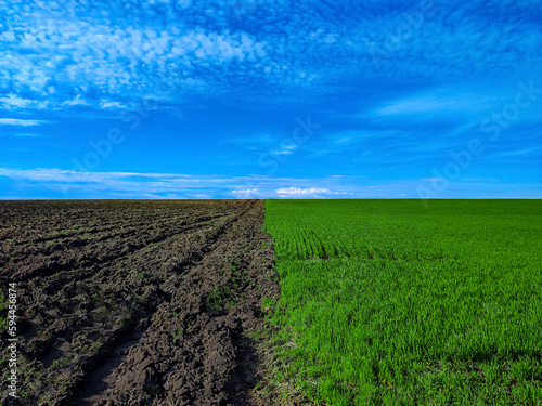 Green seedlings of winter crops on a plowed agricultural field.