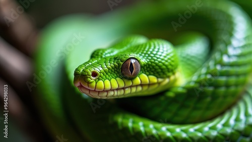 Green Snake with Various Shades of Green and Yellowish Patterns on a Branch