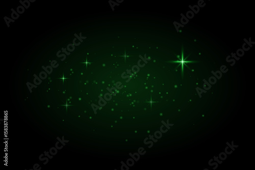 Green sparkling particles with glowing star flares on dark background. Cold light effect with dreamy fantasy feel.