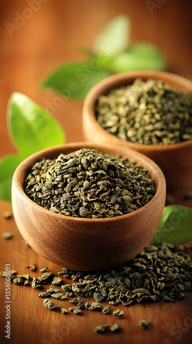 Green Tea Leaves in Wooden Bowls.