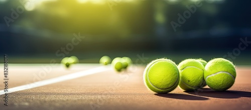 Green tennis balls on the floor at tennis court. Creative banner. Copyspace image