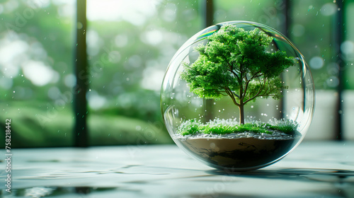 Green tree in a transparent ball. Ecology and environmental protection concept. Copy space
