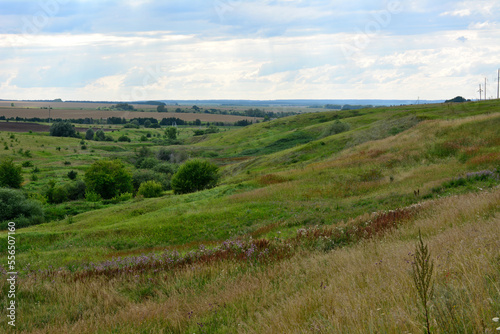 green valley with rolling hills, bushes and cloudy sky on horizon