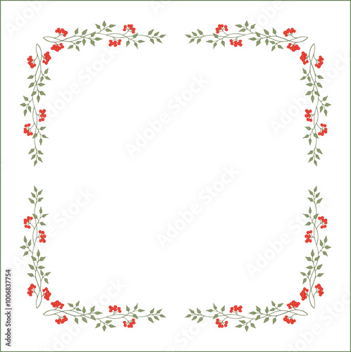 Green vegetal floral frame with berries, autumn frame, decorative corners for greeting cards, banners, business cards, invitations, menus. Isolated vector illustration.