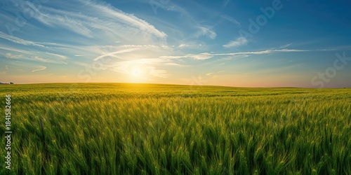 Green wheat field in spring with abundant crop growth, seasonal agricultural landscape in the evening sunlight