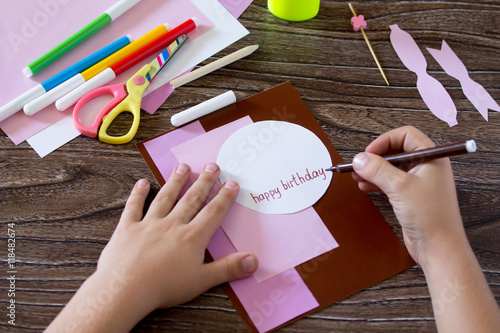 Greeting card handmade birthday cake with cream. Child draw deta