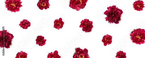 Greeting card mockup. Happy mothers day concept. Fresh pink peonies on white background top view, space for text.