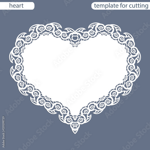 Greeting card with openwork border, paper doily under the cake, template for cutting in the form of heart, valentine card, wedding invitation, decorative plate is laser cut, vector illustrations.