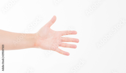 Greeting hand. Caucasian arm. Mock up. Copy space. Template. Blank.