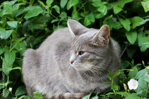 Grey cat laying on a summer grass. Portrait of kitten looking into the distance
