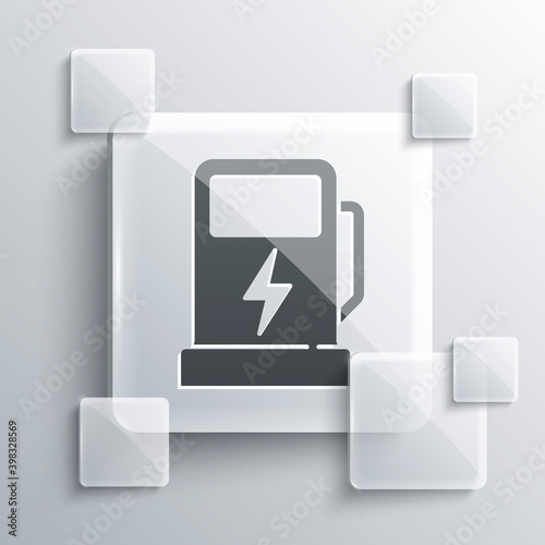 Grey Electric car charging station icon isolated on grey background. Eco electric fuel pump sign. Square glass panels. Vector.