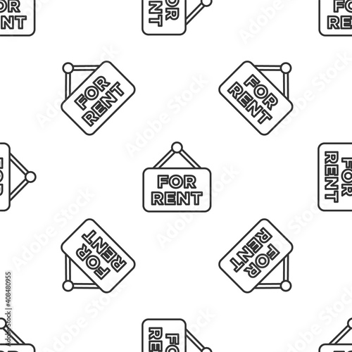 Grey line Hanging sign with text For Rent icon isolated seamless pattern on white background. Signboard with text For Rent. Vector.