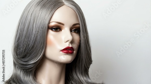 grey long hair wig in a mannequin head in white backgr background