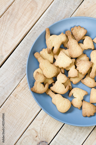 Grey plate with tasty cookies in the form of figurines of cats