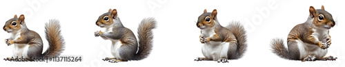 Grey squirrel collection, featuring sitting and portrait poses, isolated on a transparent background