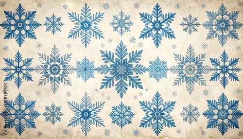 Grid of blue snowflake illustrations with varied geometric designs on beige textured background for editorial seasonal photography winter decor and poetic symmetry-themed visuals