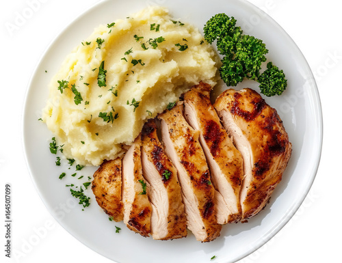 Grilled chicken breast with mashed potatoes on a plate isolated on transparent background