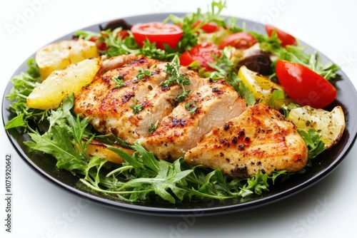 Grilled chicken breast with salad, cherry tomatoes, lemon slices and arugula.