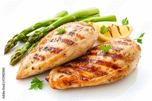 Grilled chicken breasts with asparagus and lemon on white background