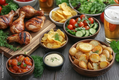 Grilled Chicken Drumsticks with Fresh Salad and Dipping Sauce: Perfect Summer Barbecue Meal for Casual Dining and Social Gatherings