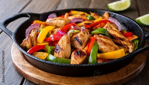 Grilled chicken fajitas with peppers and onions are served on a sizzling cast iron skillet.