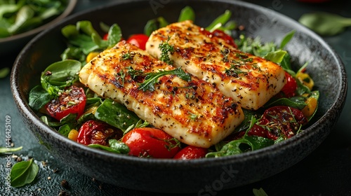 Grilled halloumi salad with cherry tomatoes and corn.