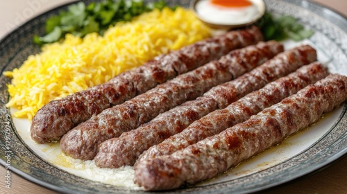 Grilled lamb skewers with rice, herbs, and sauce. Delicious Middle Eastern cuisine. Food photography for restaurant menus