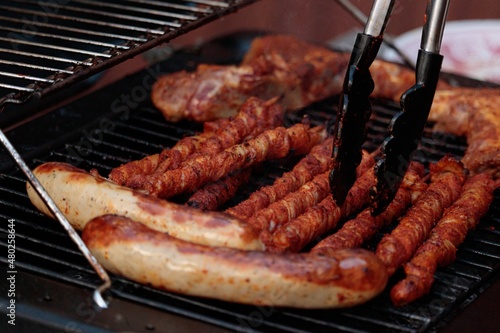 Grilled meat on a gas grill with grill tongs